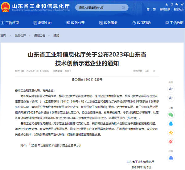 2023年11月6日,山东省工信厅网站公布了《山东省工业和信息化厅关于公布2023年山东省技术创新示范企业的通知》。经企业自愿申报、有关单位推荐、专家论证和公示等程序,认定济南迈科管道科技有限公司等107家企业为2023年山东省技术创新示范企业,名单现予公布。