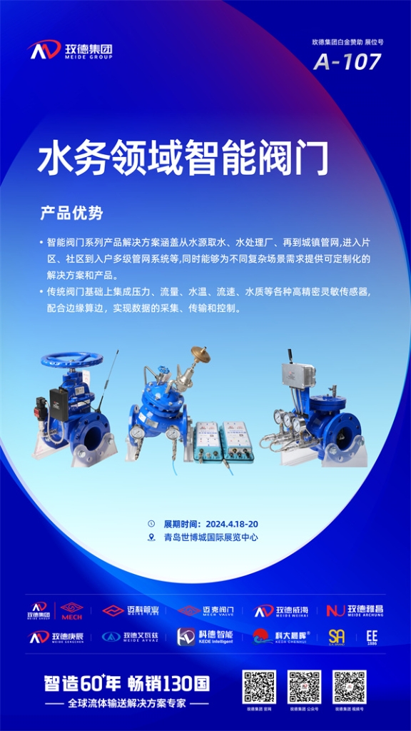 2024年4月18日-20日,玫德集团作为白金赞助商携手中国水协在青岛召开中国城镇供水排水协会2024年会暨城镇水务技术与产品交流展示会。届时玫德集团会展出大口径沟槽式钢管及管件、科大晨晖智能仪表、水务领域智能阀门、不锈钢管材管件、智慧水务整体解决方案等软硬兼具的一站式产品及解决方案。