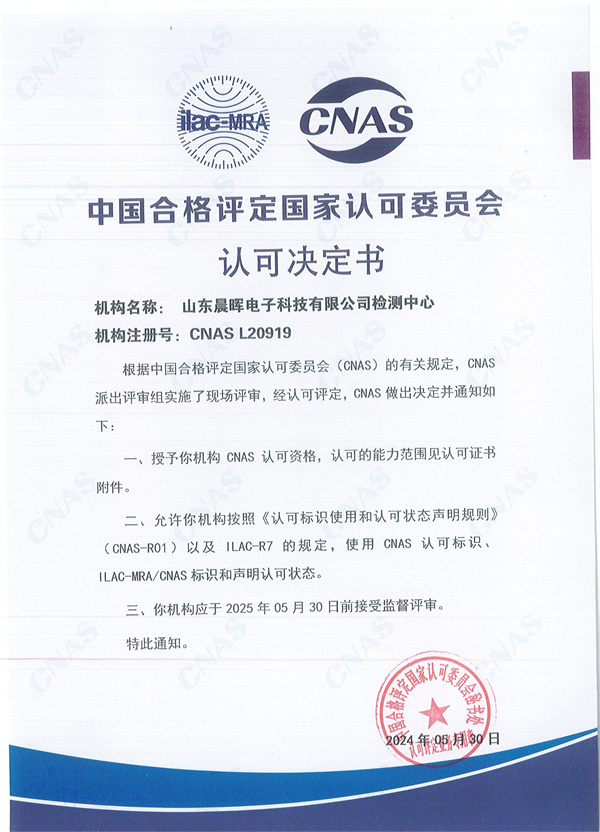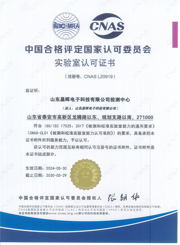 2024年6月5日,玫德集团旗下山东晨晖电子科技有限公司检测中心顺利取得CNAS实验室认可证书,并获得国际互认联合认可标识,正式进入CNAS官方网站公布的获得认可的实验室名录。