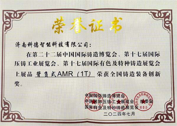 2.济南科德智能科技有限公司展品“背负式AMR(1T)”荣获全国铸造装备创新奖。
