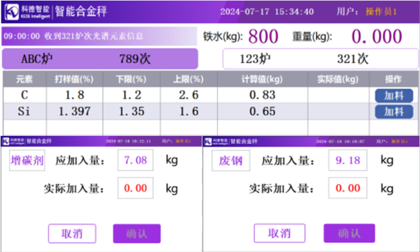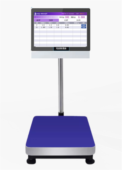 FSY-XX-TC型智能合金秤针对铸造行业电炉熔炼辅料加入场景打造的一款工业级计量产品,集成CPU和HMI系统于一体,通过光谱检测数据和材质标准并与智铸云平台、智铸云易享版APP、熔炼云小程序等集成,精确计算合金辅料补加量,实现合金加入量数据统计、分析与查询。