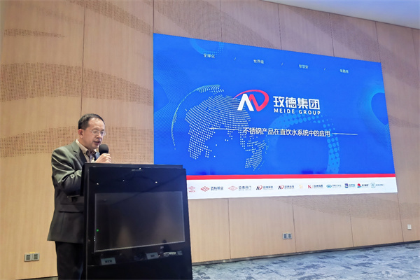 水务智能研发部总监董天晖参加9+2水司举办的供水分论坛,就《不锈钢产品在直饮水系统中的应用》为题讲述了玫德集团的水务领域产品涵盖从源头(水源接入)到龙头(饮水入户),提供从清洁原水到污水处理的一站式解决方案。