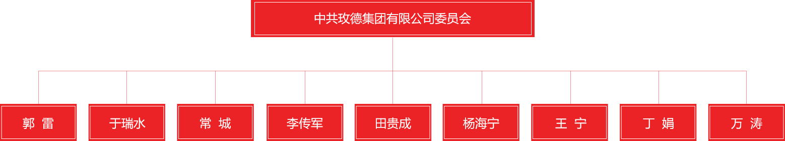 郭雷、于瑞水、常城、李传军、田贵成、杨海宁、王宁、丁娟、万涛九位同志为中共玫德集团有限公司委员会委员。郭雷同志任党委书记,于瑞水同志任党委副书记。