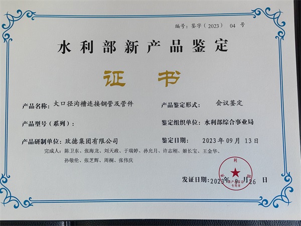 11.9月13日,玫德集团有限公司自主研制的“大口径沟槽钢管及管件”,通过水利部及行业专家鉴定,产品加工技术及能力达到国际领先水平,产品达到国际先进水平,开创了大口径埋地钢管沟槽连接的先河。