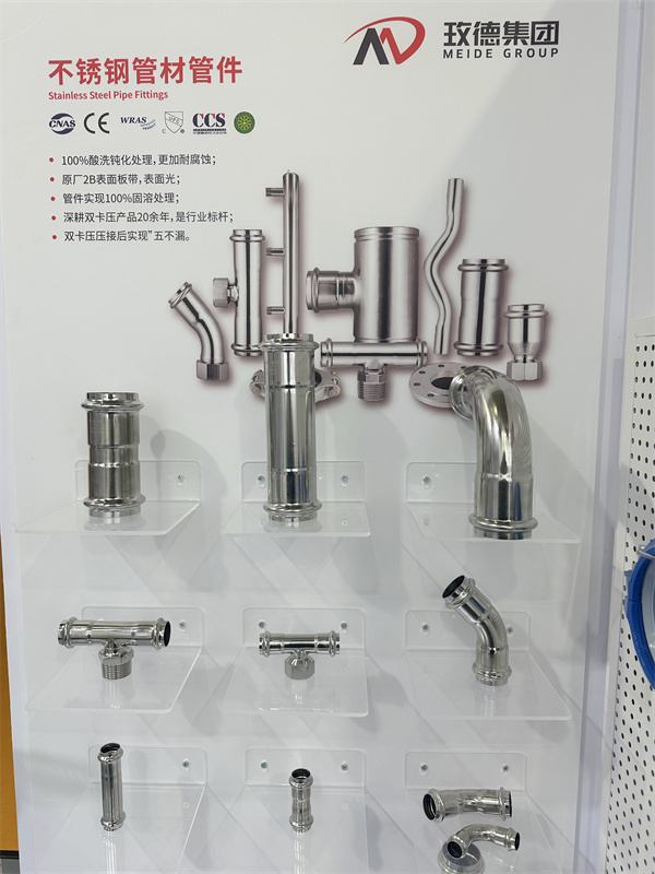 本次展会,玫德带来了玛钢管件、沟槽管件、消防系列阀门、智能阀门、直缝钢管、不锈钢管材管件、金属软管、碳钢卡压等一站式产品。