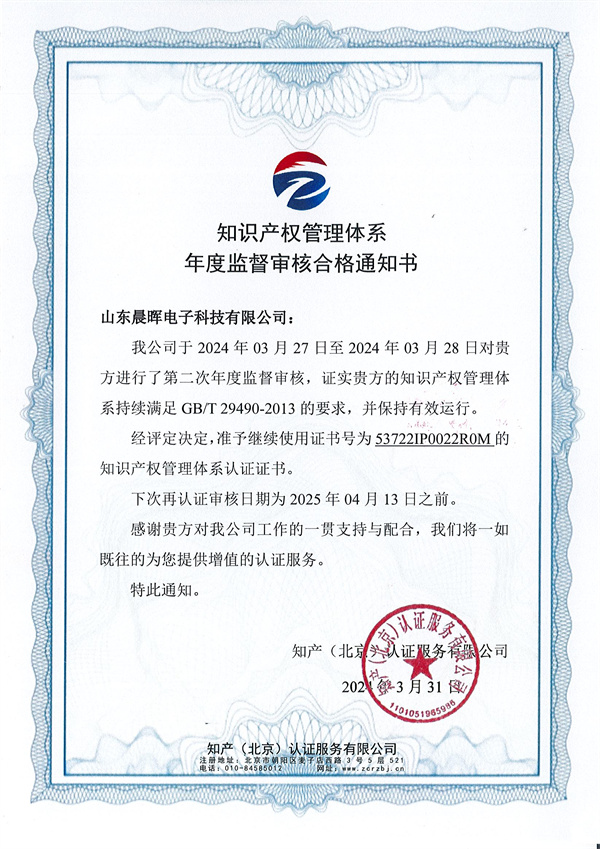 2024年3月31日,玫德集团旗下山东晨晖电子科技有限公司顺利通过了知识产权管理体系年度监督审核。这一认证标志着山东晨晖在知识产权管理方面迈出了坚实的一步,进一步在行业内树立了权威和信誉。