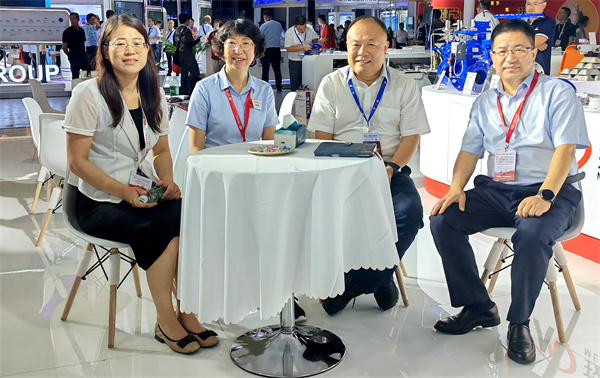 济南圣泉集团股份有限公司总裁唐地源、烟台胜地汽车零部件制造有限公司总裁张宝芝莅临玫德展位参观考察,玫德集团董事局主席孔令磊与其共同探讨玫德集团智能制造以及数字化工厂解决方案。