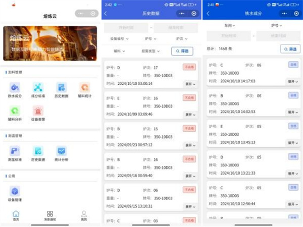 管理人员足不出户即可对现场设备进行管理、工人加料结果管理和设备状态异常管理。支持根据年/月/日/炉号进行历史数据查询与统计,实现产品质量100%追溯。
