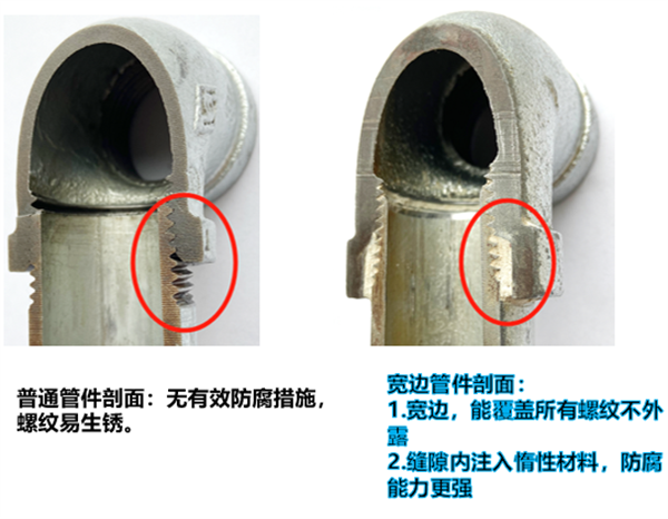 区别于传统管件,玫德宽边玛钢燃气管件采用突破性的宽边构造,能将所有螺纹紧密覆盖,使其完全不外露。这一设计从根本上消除了因螺纹裸露,在长期使用过程中可能因磨损、松动而引发燃气泄漏的风险。对比普通燃气管件连接时,钢管会有 2 - 3 扣螺纹暴露在外的情况,玫德管件的安全性得到了质的提升。