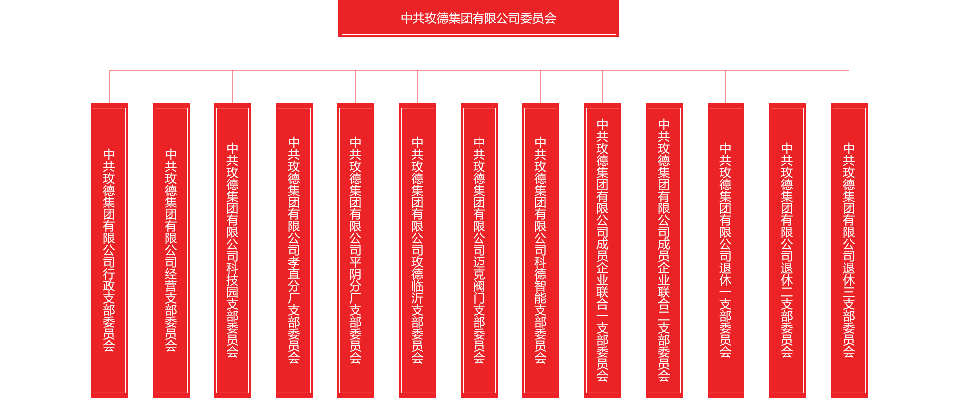 1.中共玫德集团有限公司行政支部委员会    2.中共玫德集团有限公司经营支部委员会    3.中共玫德集团有限公司科技园支部委员会    4.中共玫德集团有限公司孝直分厂支部委员会    5.中共玫德集团有限公司平阴分厂支部委员会    6.中共玫德集团有限公司玫德临沂支部委员会    7.中共玫德集团有限公司迈克阀门支部委员会    8.中共玫德集团有限公司科德智能支部委员会    9.中共玫德集团有限公司成员企业联合一支部委员会    10.中共玫德集团有限公司成员企业联合二支部委员会    11.中共玫德集团有限公司退休一支部委员会    12.中共玫德集团有限公司退休二支部委员会    13.中共玫德集团有限公司退休三支部委员会